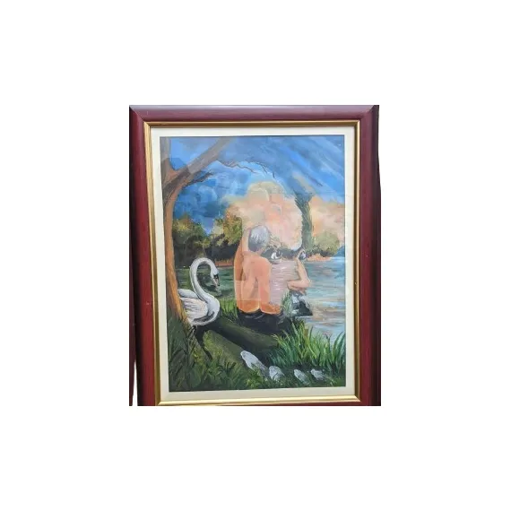 Immerse yourself in the tranquil beauty of "Reflections by the Lake", a captivating hand-painted artwork that depicts a peaceful riverside moment. A seated figure, swan, and soft rippling waters are framed by lush greenery and a glowing sky, creating a serene escape from the chaos of everyday life. Perfect for adding calm and elegance to any living space, this piece celebrates the harmony between humans, animals, and nature.
