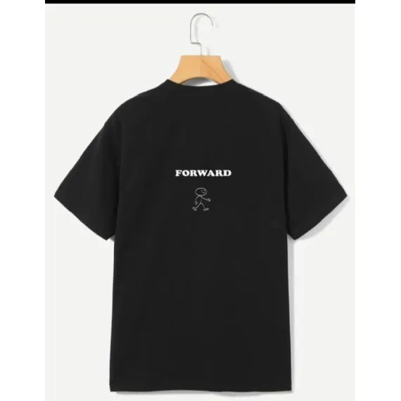 Embrace progress with the Forward Thinker T-Shirt. This classic black t-shirt features a bold "FORWARD" graphic above a playful, hand-drawn stick figure striding purposefully ahead, all rendered in a clean white print. Made from soft, breathable cotton, this garment offers a comfortable, relaxed fit that is perfect for any casual occasion. More than just a t-shirt, it's a subtle reminder to keep moving forward, stay optimistic, and tackle new challenges with a positive mindset. Wear your ambition.