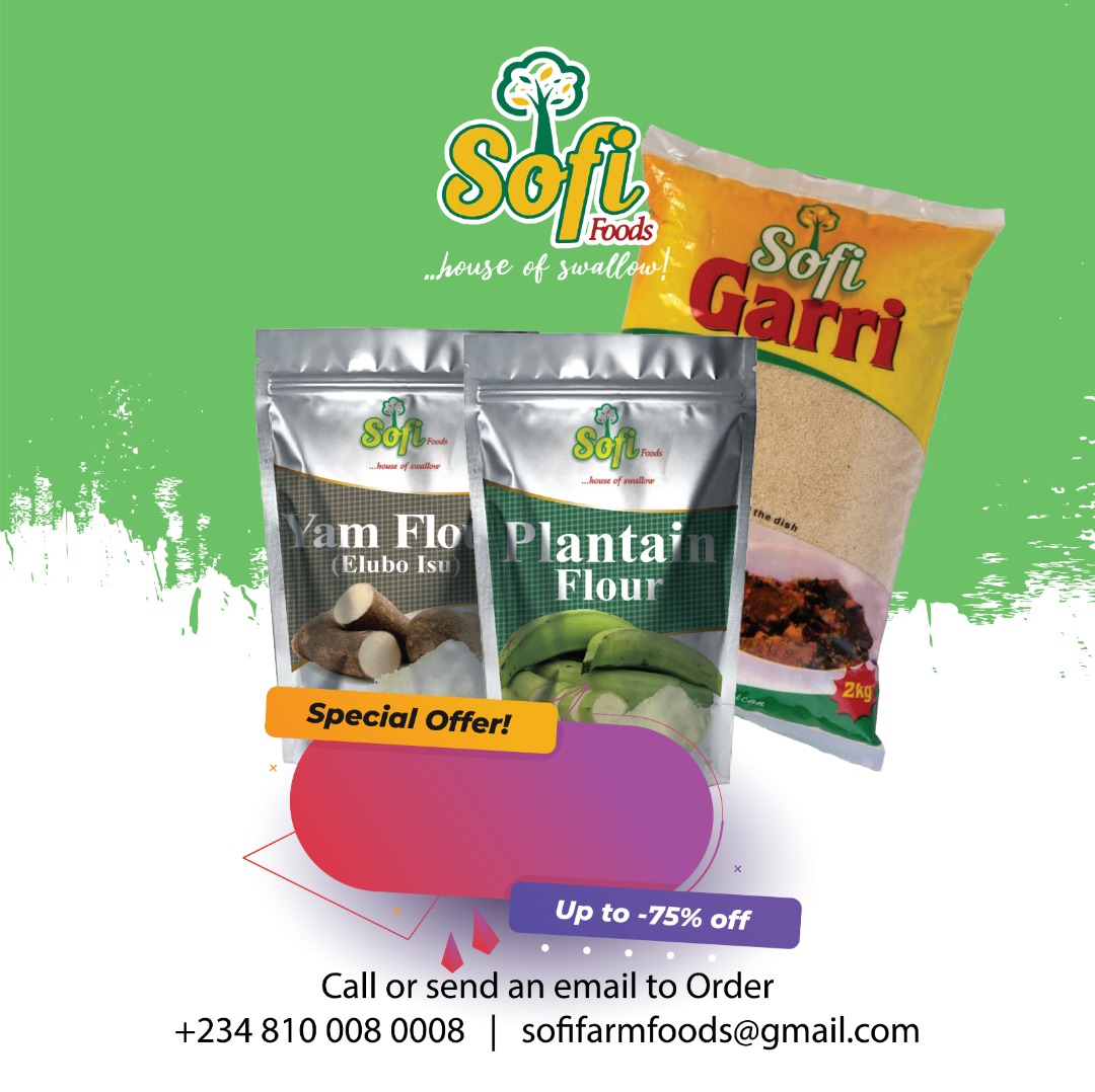 Garri 2kg, Yam Flour 1kg, plantain Flour 500g