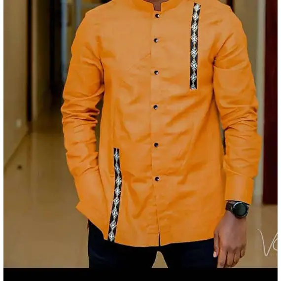 Men’s Custom Made Yellow-Orange Shirt with Imigongo Art Print – Long Sleeve Cotton Dress Shirt Made in Rwanda
